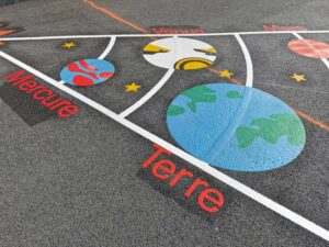 C’est précisément dans cette logique que je conçois des jeux éducatifs récréation. Il ne s’agit pas seulement de marquage au sol décoratif, mais de véritables supports pédagogiques intégrés à la cour d’école, permettant de travailler des compétences définies dans les programmes de l’Éducation nationale.