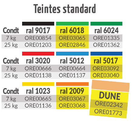 Cette peinture routière de couleur s’applique facilement au rouleau ou à l’airless et offre une large palette de 9 couleurs standards éclatantes.